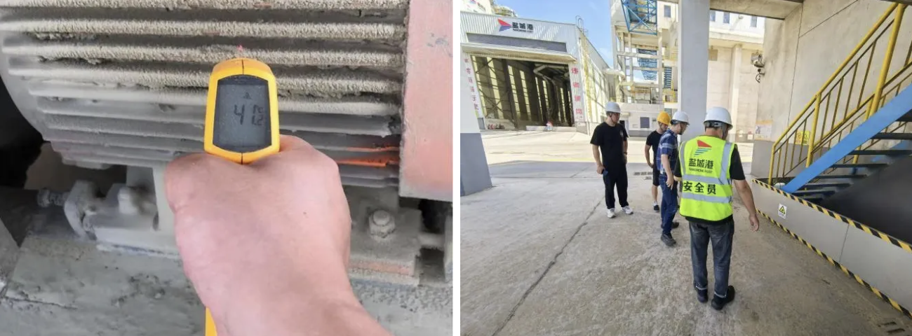 筒倉高溫巡檢現場,安全員手持測溫槍,俯身檢測設備設施溫度,起身檢查倉頂通風閥密封性,反復確認消防器材壓力值,用細致檢查、精準測溫,守住安全與品質的雙重底線。