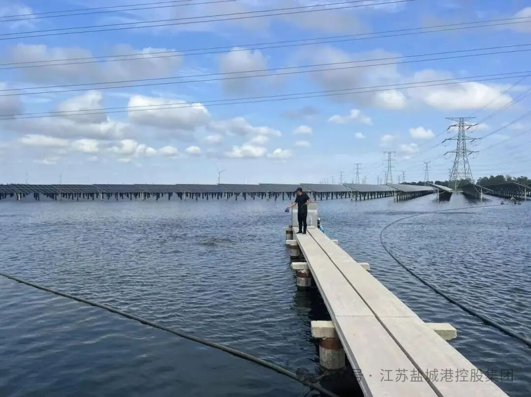 在鹽農華豐7956畝的水域上,光伏板整齊排列如藍色海洋,水下魚蝦游弋正歡。這個由鹽城港集團與悅達投資聯合打造的項目,以“一地兩用、漁光互補”模式實現“上發電、下養魚”的生態奇跡。自2024年10月15日并網運行以來,年均發電量達4.43億千瓦時,每年可節約標煤13.34萬噸,減少二氧化碳排放36.65萬噸,提升養殖密度20%。
