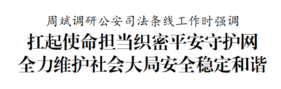在調研中,周斌指出,公安司法條線是維護社會穩定的“主力軍”、服務高質量發展的“護航員”。要突出政治引領,服務發展大局,圍繞優化營商環境、護航產業發展、保障民生福祉等中心任務,找準工作切入點和發力點,為高質量發展提供堅強法治保障。要深化社會治理,堅持和發展新時代“楓橋經驗”,完善網格化管理、精細化服務、信息化支撐的基層治理平臺,提升社會治理現代化水平。要堅守人民立場,聚焦群眾“急難愁盼”,扎實推進平安建設、掃黑除惡、未成年人保護等工作,不斷增強人民群眾的獲得感、幸福感、安全感。