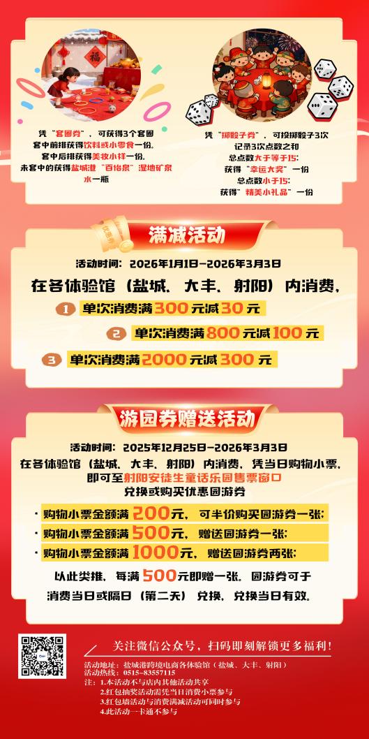 買(mǎi)年貨的同時(shí),別忘為親子時(shí)光添份樂(lè)趣!活動(dòng)期間,憑當(dāng)日購(gòu)物小票即可前往射陽(yáng)安徒生童話(huà)樂(lè)園兌換專(zhuān)屬游園優(yōu)惠。單筆消費(fèi)滿(mǎn)500元即贈(zèng)游園券1張,多買(mǎi)多贈(zèng),讓童話(huà)世界的歡聲笑語(yǔ),成為這個(gè)新年最溫暖的記憶。