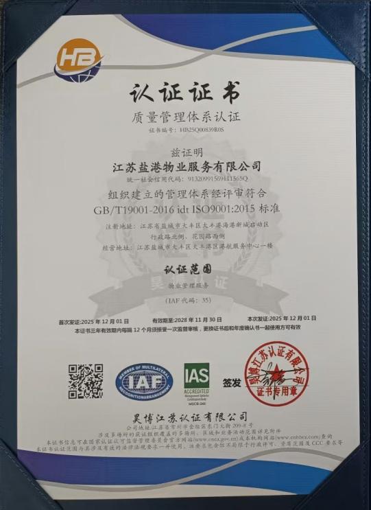 作為鹽城港集團的物業(yè)管理企業(yè),鹽港物業(yè)始終秉持“客戶至上、精益求精、責(zé)任擔(dān)當(dāng)” 的核心價值觀,專注于為綜合體辦公樓、住宅小區(qū)等各類物業(yè)項目提供全方位、高品質(zhì)的物業(yè)服務(wù)。此次認證過程中,審核機構(gòu)依據(jù) ISO 相關(guān)國際標準,對公司的管理體系進行了全流程、多維度的嚴苛評審,涵蓋制度建設(shè)、流程執(zhí)行、風(fēng)險管控、服務(wù)質(zhì)量、環(huán)境治理、員工權(quán)益保障、社會責(zé)任履行等多個關(guān)鍵環(huán)節(jié)。通過查閱資料、現(xiàn)場核查、人員訪談等多種方式的全面檢驗,鹽港物業(yè)的管理體系因其完整性、合規(guī)性、有效性得到了審核專家的高度認可,最終順利通過全部認證。