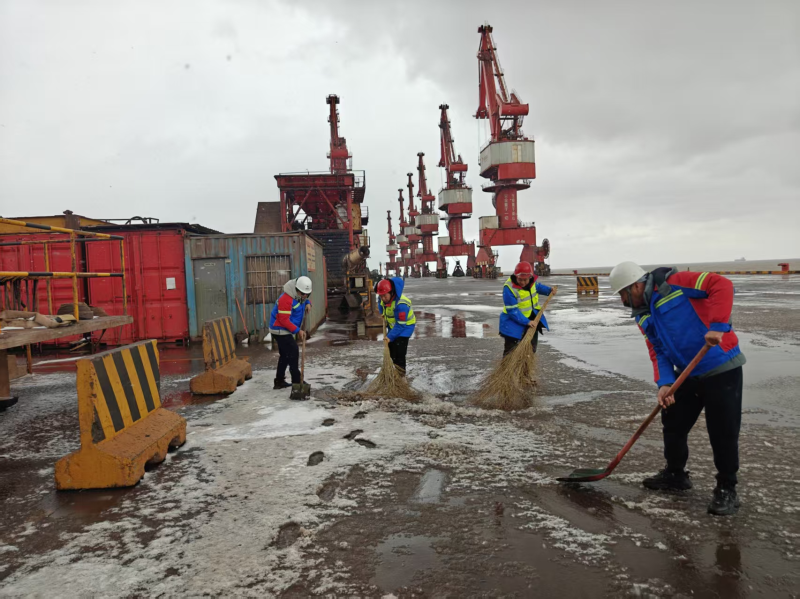 保稅物流中心領(lǐng)導(dǎo)班子靠前指揮,提前備足工業(yè)鹽等防凍融雪物資,組織全體干部職工開(kāi)展鏟雪除冰行動(dòng)。大家不畏嚴(yán)寒、分工有序,重點(diǎn)清掃場(chǎng)區(qū)主干道、物流出入口、停車場(chǎng)等關(guān)鍵區(qū)域,黨員干部沖鋒在前,青年職工奮勇?lián)?dāng),經(jīng)過(guò)數(shù)小時(shí)連續(xù)作業(yè),徹底清除主要通行區(qū)域積雪積冰,有力保障了物流車輛暢通與生產(chǎn)作業(yè)有序運(yùn)行。濱海港區(qū)各單位更是多點(diǎn)發(fā)力,投資公司優(yōu)化作業(yè)流程和行車路線,設(shè)立現(xiàn)場(chǎng)管理員科學(xué)調(diào)度;港務(wù)公司與客戶高效聯(lián)動(dòng),保障貨源供應(yīng)鏈暢通;物流公司聚焦技術(shù)攻堅(jiān)、市場(chǎng)拓展和人才培養(yǎng),在寒冬中積蓄發(fā)展動(dòng)能。