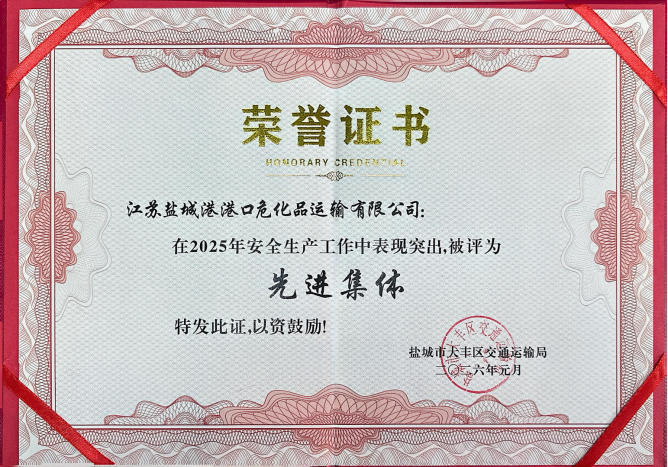 近日,鹽城港港口危化品運輸有限公司憑借扎實有效的安全生產管理工作、突出的安全風險防控成效,榮獲大豐區交通局授予的“2025年安全生產工作先進集體”榮譽稱號,用責任與擔當樹立了?;沸袠I安全規范經營的標桿。