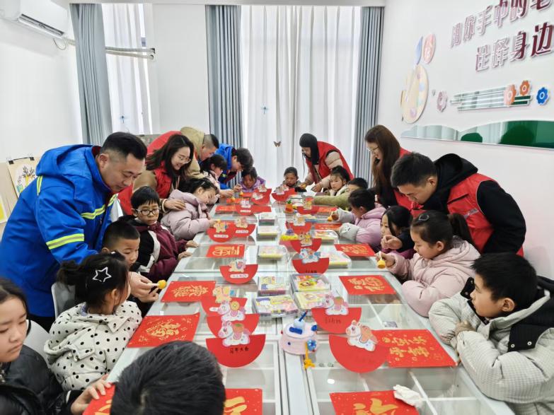 活動當日下午,在陳家港鎮未成年人保護工作站的圖書室里,20名留守兒童在志愿者的陪伴下認真閱讀課外書籍,沉浸在書香之中。隨后的游戲環節里,志愿者們與孩子們玩起擊鼓傳玩具的游戲,音樂聲時而急促、時而舒緩,每當鼓聲停下,拿到玩具的孩子便大方地說出一個帶“馬”字的四字詞語,現場歡聲笑語不斷。在手工制作室,孩子們在志愿者的耐心指導下,動手粘貼馬年玩具,并親手拓印出金光閃閃的“福”字,感受傳統文化的魅力?;顒幼詈螅懰蹍^志愿者們為孩子們發放了新年禮品和壓歲紅包,送上滿滿的新春祝福。